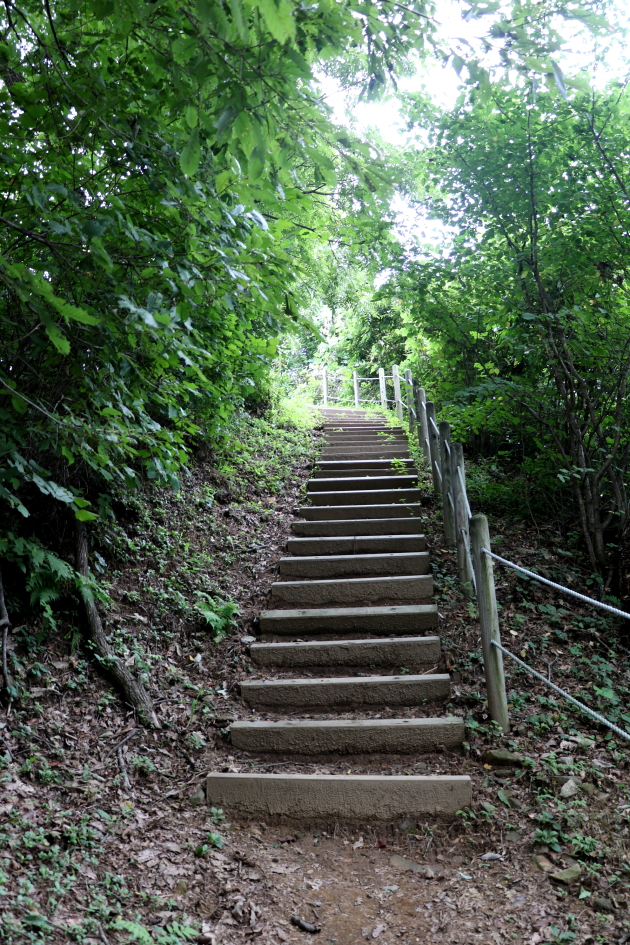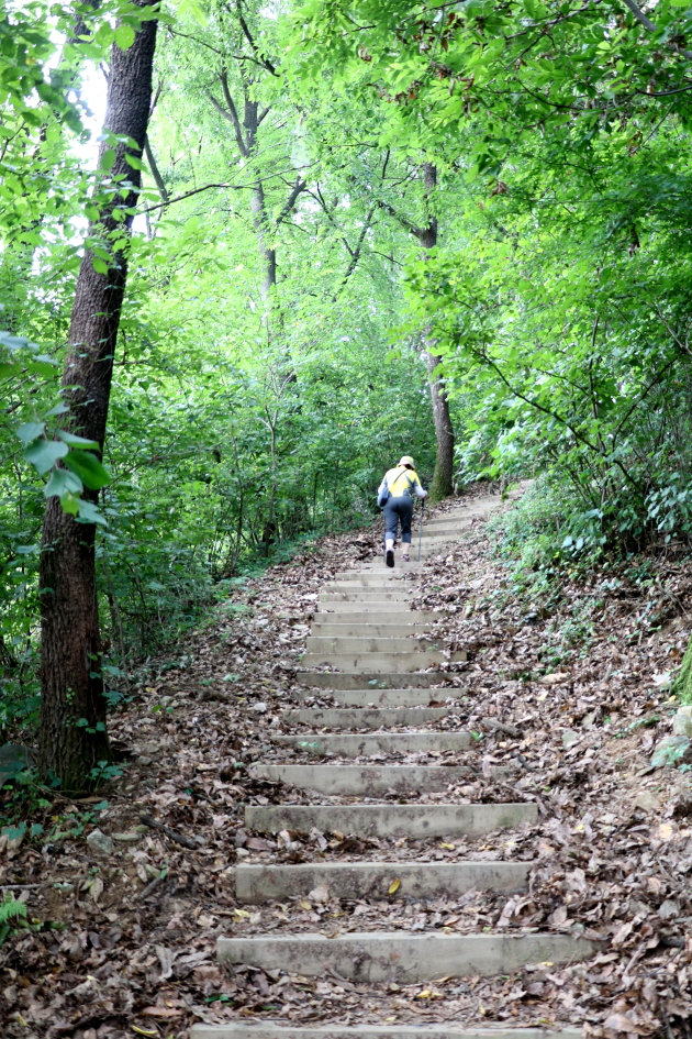 정상이 가까워지고 있는지 가파른 경사의 나무계단이 보이며 경사를 힘껏 올려친다.