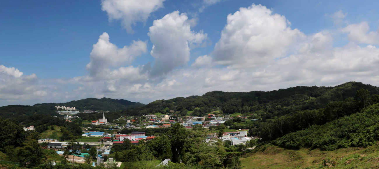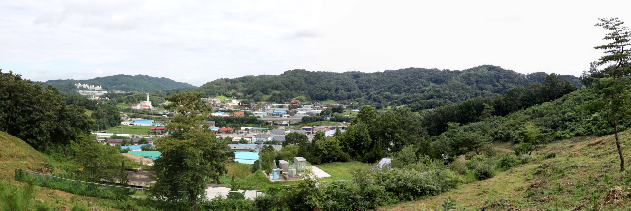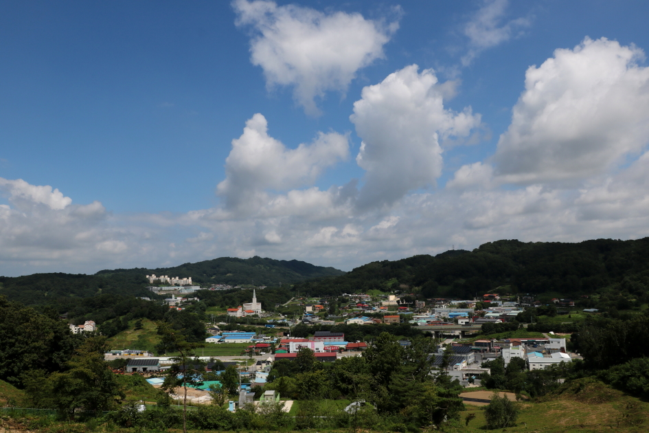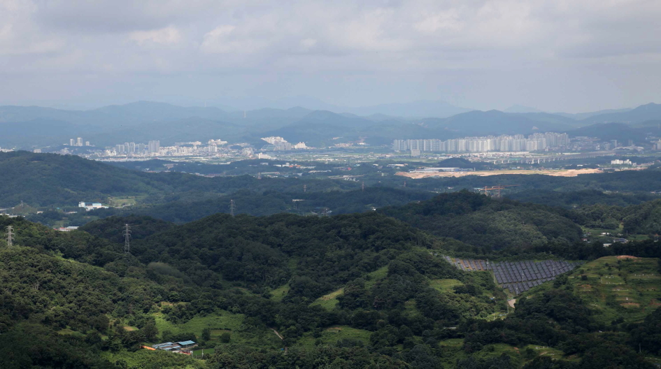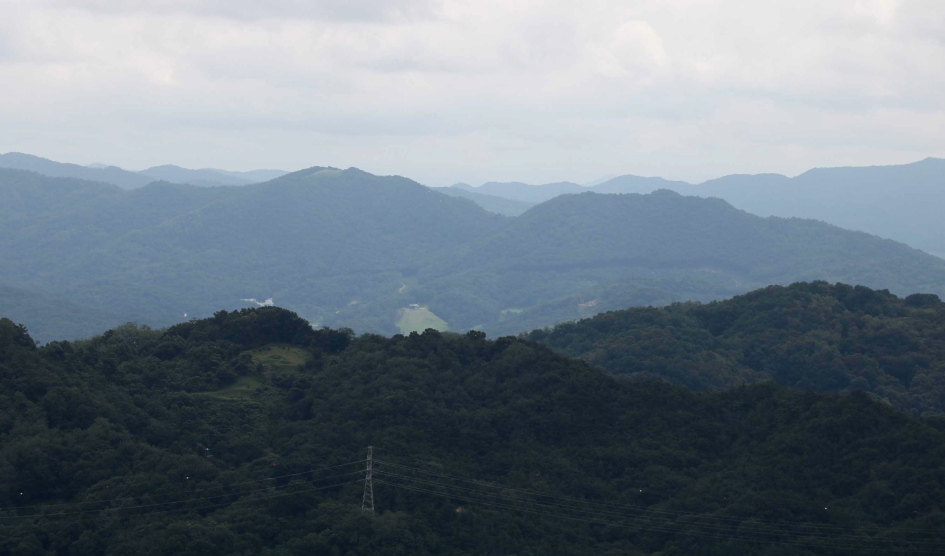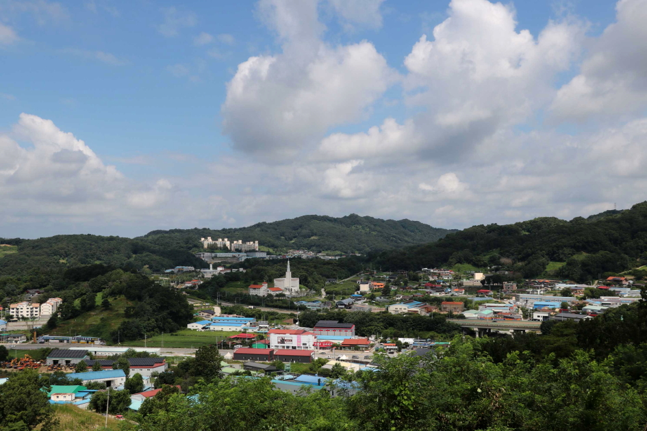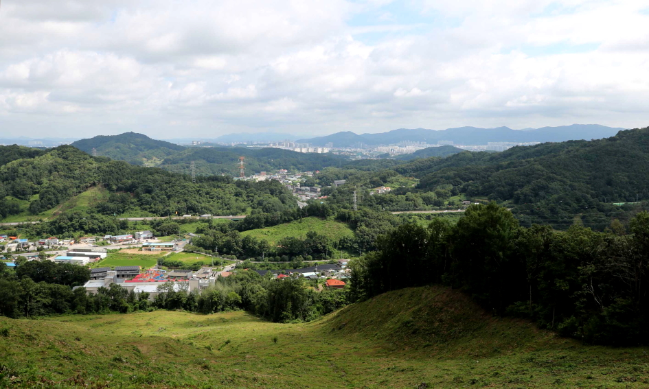 동쪽 방향에는 한남금북정맥과 팔봉지맥이 하늘금을 그리는 능선이 자리하고 있다.