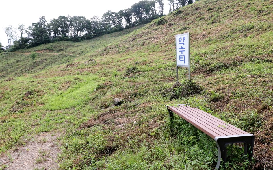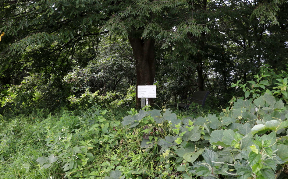 맞은편에는 기념식수나무 아래에는 나무의자가 자리하고 삼각점이 설치되어 있다.