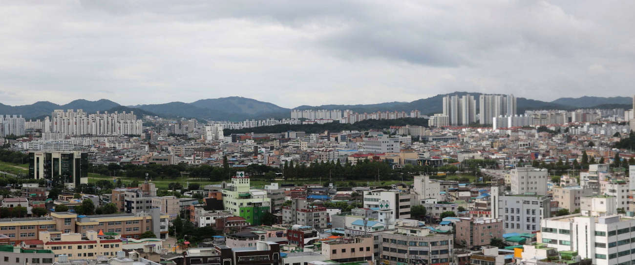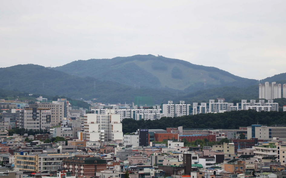 상당구 동남지구의 아파트를 당겨보니 오른쪽으로는 선도산이 자리한 모습이다.