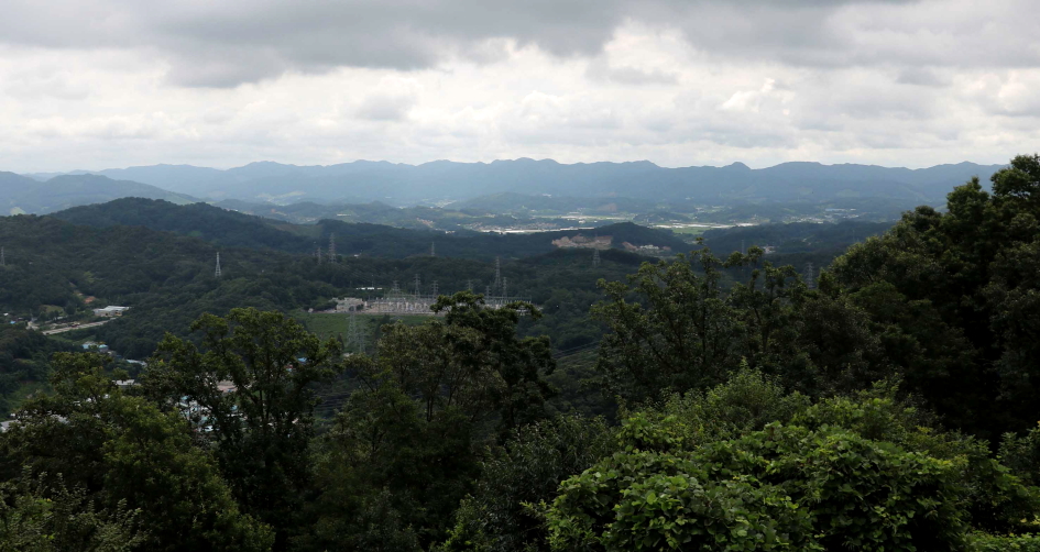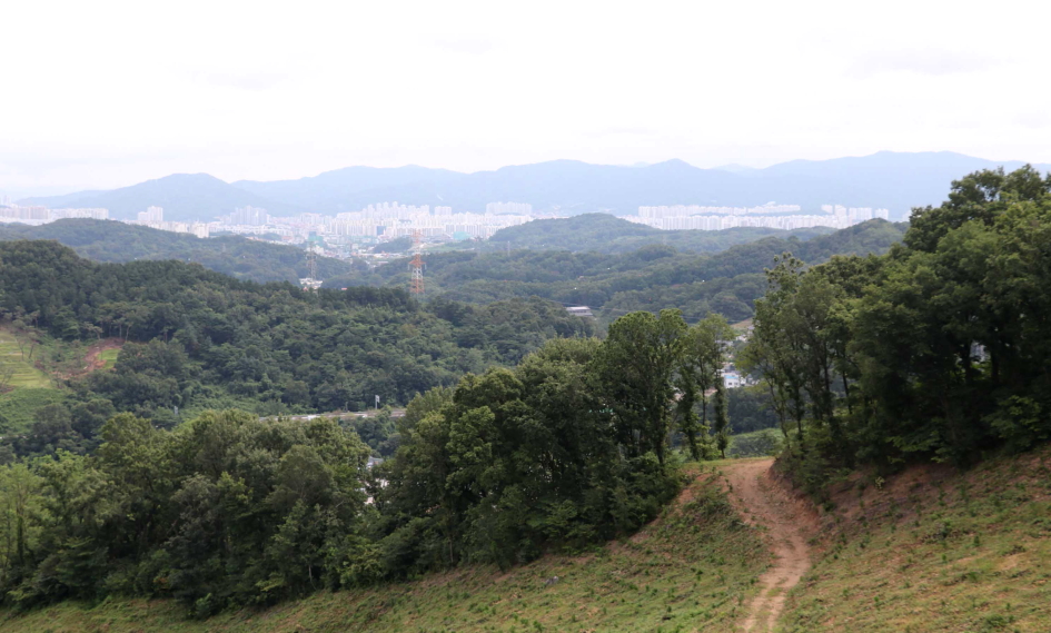 벌목지 아래에 남이배수지가 자리하였고 뒤쪽으로 팔봉산, 용덕산이 바라보인다.