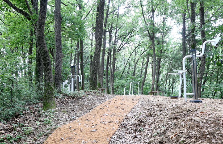 공터에는 운동기구가 설치되어 있고 쉬어갈 수 있는 나무의자가 자리하고 있기도..