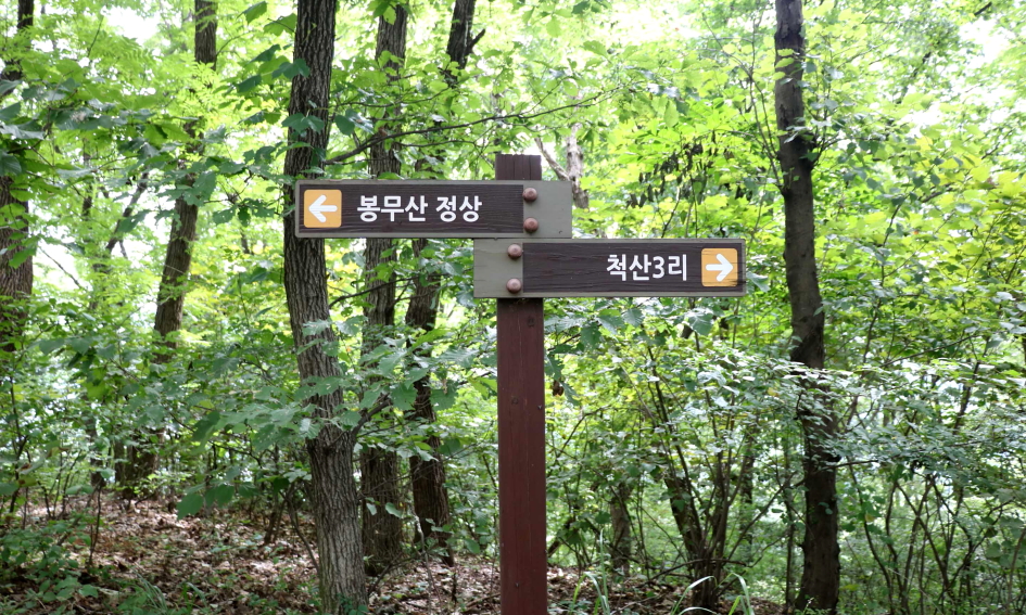 봉무산과 척산 3리의 이정표가 서있는 모습이고 갈림길이 나타나 좌틀로 내려선다.
