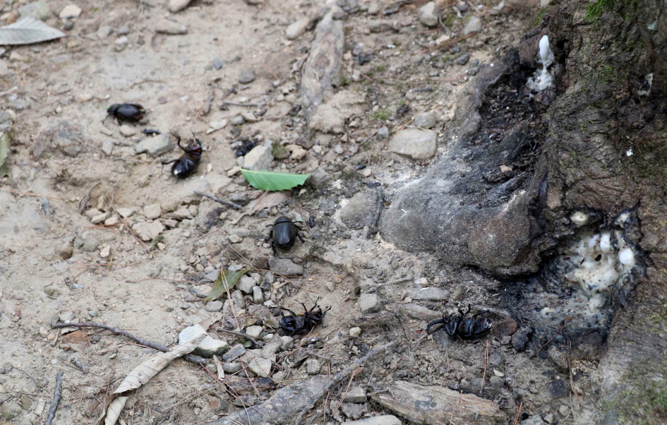 참나무 수액 주변에 많은 장수풍뎅이가 죽어 있는 모습이 보이는데 의문이 들기도..