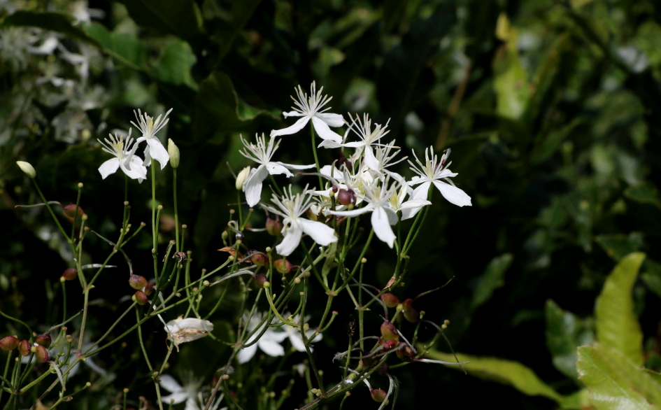 전국적으로 산기슭이나 들에서 자라는 덩굴식물인 으아리가 하얀 꽃을 피운 모습이..