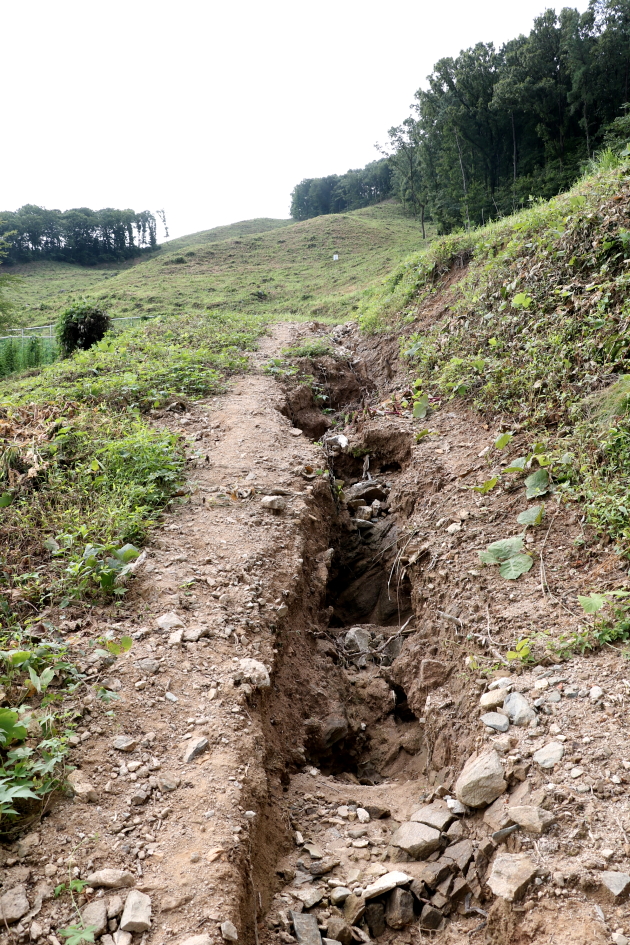 등로에는 작년에 많은 폭우로 유실된 산길이 커다란 구덩이를 만들어 놓은 모습이다.