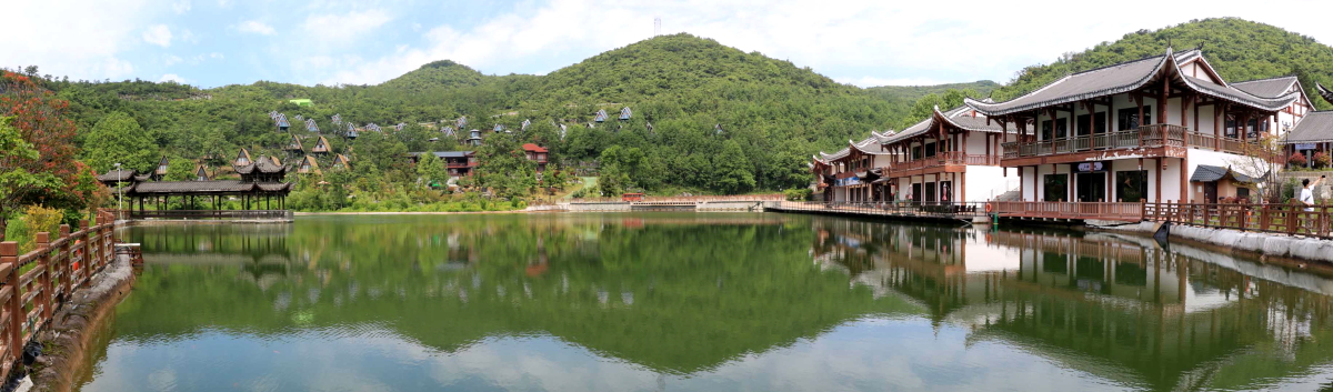 케이블카에서 내리자 호수와 중국풍의 건축 중인 온천 호텔이 보이고 주변에 보이는 산들은