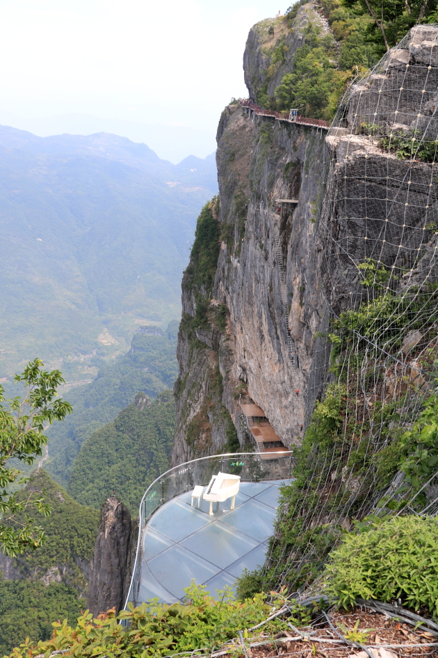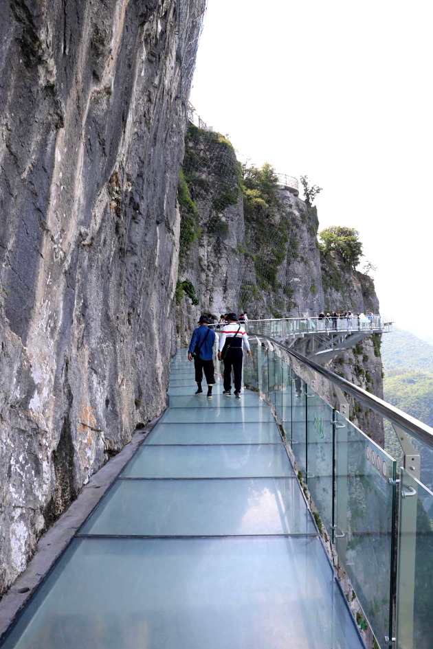 유리잔도는 해발 1,300m가 넘는 벼랑 옆으로 돌출되어 있으며 길이 200m, 폭 1.9m의 규모로